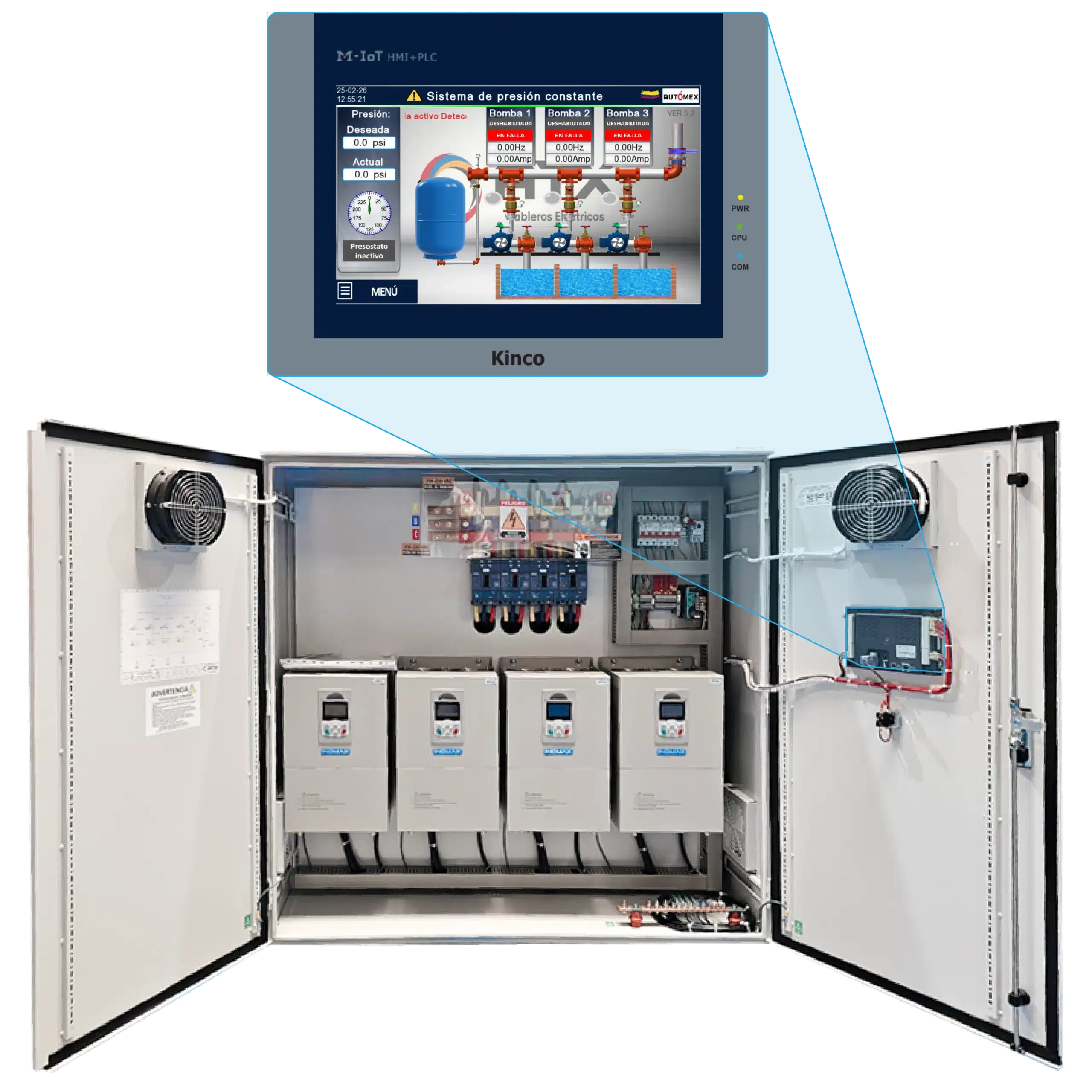 Desarrollados por Automex SAS, los sistemas de presión constante cuentan con un controlador de bombas especializado con pantalla HMI de siete (7) pulgadas, touch screen, full color que facilita la programación, puesta en marcha y operación al usuario, integrado a variadores de velocidad Inomaxthech MAX500 Vectorial de alto desempeño, permite entregar confiabilidad, protección del sistema, menos paradas y entrega el agua como debe ser, constante.