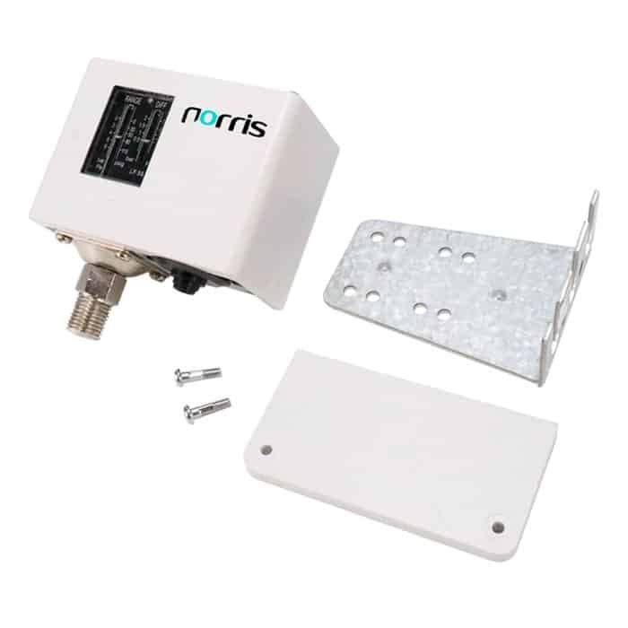Presostato industrial ajustable marca Norris para sistemas de alta presión. El modelo NRPKPI38 ofrece un rango de 72 a 435 PSI con conexión de 1/4″ NPT. Su robustez y grado IP44 lo hacen indispensable en aplicaciones que requieren un control de presión superior a los 300 PSI con precisión absoluta.