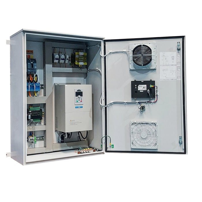 Tablero ATX para presión constante con variador de velocidad Inomaxtech. Incluye pantalla táctil para una gestión visual e intuitiva de una bomba de 2.0 Hp a 220 Vac. Ideal para aplicaciones que requieren un flujo preciso y ahorro energético.