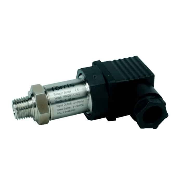 Transductor de presión Norris de alto desempeño para monitoreo industrial. Rango de medición de 0-20 bar con conexión 1/4″ NPT. Fabricado en acero inoxidable, opera con un voltaje de 9-30 Vdc y entrega una señal de salida analógica de 4-20 mA para integración con controladores y PLC.